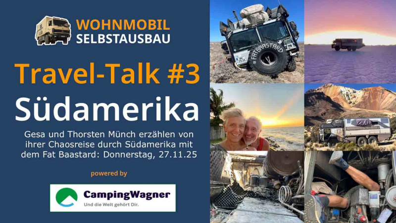 Im Traval Talk #3 interviewen wir die beiden Overlander Gesa und Thorsten Münch. Sie sind mit ihrem MAN Kat 1 6x6 durch Südamerika gereist und berichten von ihren Highlight, aber auch von ihren zahlreichen "Low-Lights" auf der Reise. Stichworte: auf der Fähre ausgeraubt, Motorbrand, Dengue-Fieber, Heizung zertrümmert, unzählige Reifenschäden, Karre versenkt, ...