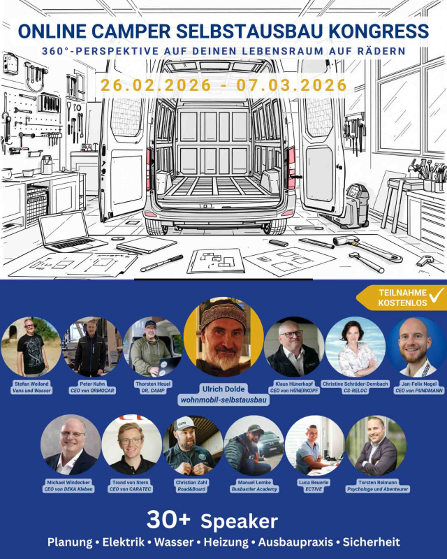 Am 26.02.26 startet der Online Camper Selbstausbau Kongress von Leo Tscherkasow mit über 30 Speakern zu allen Themen rund um das Thema Wohnmobil-Selbstausbau. Ich habe die Ehre, dass Leo mit mir das Eröffnungsinterview führt.