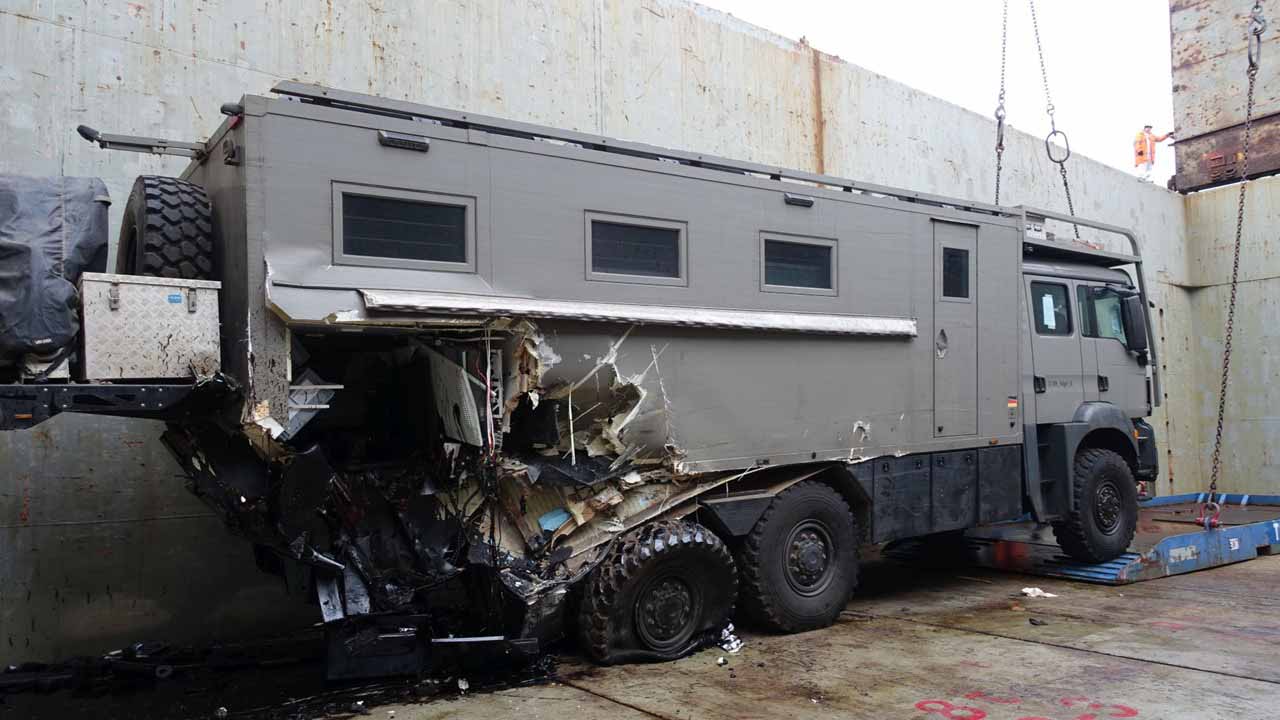 Transportschaden auf dem Schiff während der Verschiffung nach Südamerika. Bei hohem Seegang hat sich ein Container gelöst und ist in dieses Expeditionsmobile eingeschlagen. Die Gesamtschadensumme lag so hoch, dass es sich um einen wirtschaftlichen Totalschaden handelte.