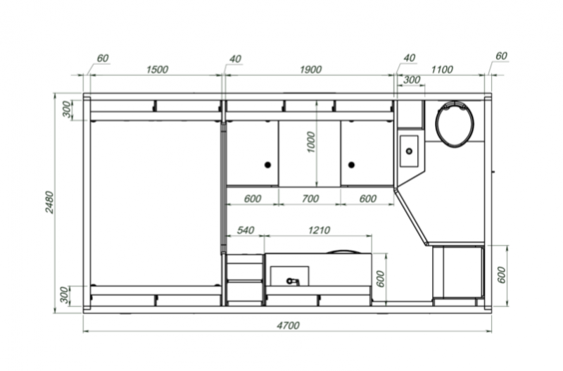 | Kabinenmaße Abmessungen (außen) | 4700 x 2480 x 2200 |