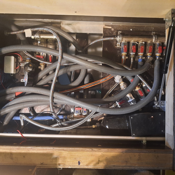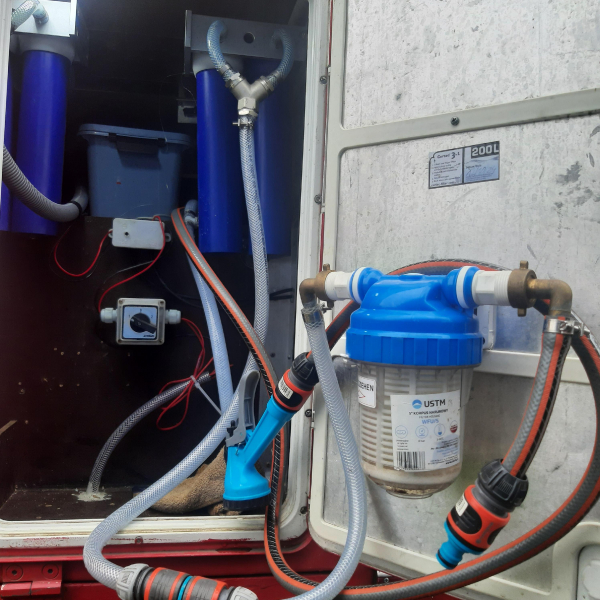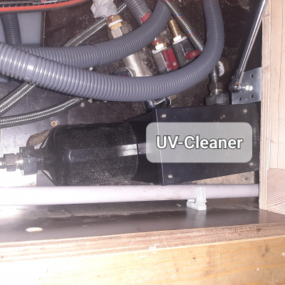 Wasserführung | Oberflächenwasser mit Kärcherpumpe durch Keramikfilter in die Tanks. Brauchwasser mit Druckpumpe durch UV-Cleaner und Kohlefilter zu den Verbauchern. |