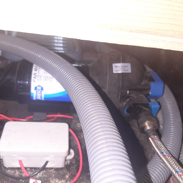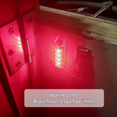 Bei eingeschalteter Brauchwasser-Druckpumpe leuchtet innen und Außen eine Warnleuchte. Dadurch wird verhindert, dass man die Pumpe angeschaltet lässt und weggeht. So wird verhindert, dass bei einem Leck der Druck absinkt und das ganze Wasser aus einem Tank in den Aufbau gepumpt wird |