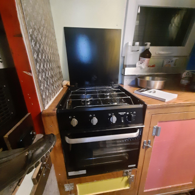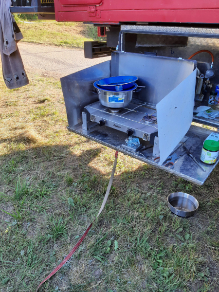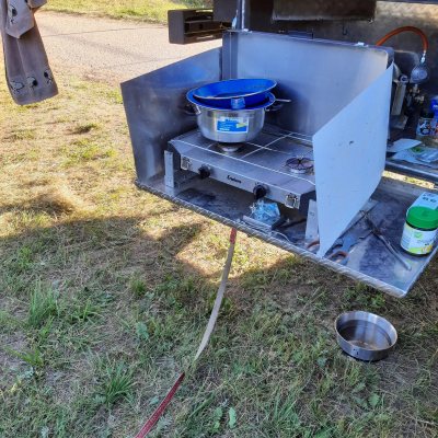 Kocher | Außenküche mit 2-flammigem Kocher von Enders in Klappe vom Staukasten fest verbaut. 5kg-Flasche im Staukasten. |