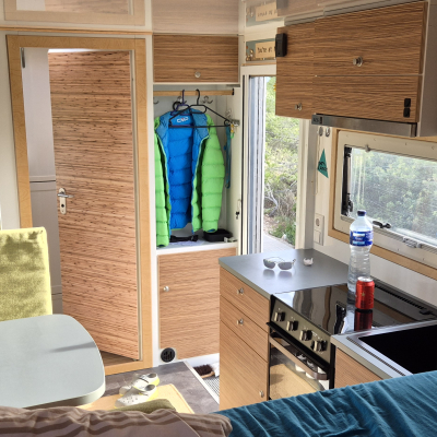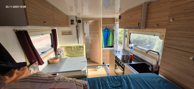 Eingangstüre, Durchgangstüre zum Fahrerhaus sowie Stauraumklappen sind von Outbound. Doppelboden ca. 200 mm, hauptsächlich für Technik. Teilweise auch noch als Stauraum nutzbar. Die Seitz-Fenster wurden als erstes umgerüstet da sie nicht moskitodicht sind. Moskitonetze wurden gegen schwarze Neher-Netze getauscht. Diese sind nun breiter und reichen seitlich ganz bis an den Rand, so das hier keine Moskitos mehr durchkommen. Das Material ist stabil und schrumpft nicht mit der Zeit. Außerdem sind sie schwarz un bieten einen super Durchblick. Über den Rollen wurden außerdem Bürstendichtungen angebracht, so das auch hier dicht ist. Die Verdunklungen wurden ebenfalls neu gemacht, mit dem gleichen Material, jedoch ebenfalls breiter bis an den Rand. Für den Durchgang zum Fahrerhaus wurde ein Stück der Kabinenwand verwendet (Reststück Fensterausschnitt) und mit Schloss und Griffen versehen. 2 Gasdruckdämpfer halten die Klappe offen. | |