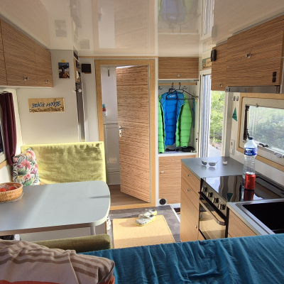 Die Hängeschränke wurden mit einem Zwischenrahmen aus Tischlerplatten mit Sikaflex 292i an die Decke geklebt. In den Zw.rahmen befinden sich mehrere M8 Gewindeinsätze, die Schränke können somit jederzeit abgeschraubt werden. Die Platten für das Bett sind 30 mm dick, wiegen jedoch nur 4 kg/qm. Garnica Ultralight Pappel Sandwich. Die Matratze ist 160 x 200 cm. Links und rechts davon sind dann noch je 8 cm Platz für Ablage und Lichtschalter. Die Soundbar hängt an die Rückwand unter die Decke. Hierfür wurde eine Konsole mit integrierter Beleuchtung gebaut. Die Duschwanne ist Eigenbau. Hierfür wurde eine Positivform aus MDF-Platten gebaut, gespachtelt, geschliffen, gefüllert und lackiert. Danach überlaminiert, geschliffen und lackiert. Der Doppelboden (18 cm lichte Höhe) besteht komplett aus Klappen und lässt sich vom Bett bis zur Eingangstür vollständig öffnen. In einem Abteil sind Wasserpumpe, Druckbehälter, Druckminderer, etc.. In einem anderen wird, gut zugänglich, die Elektrik installiert (außer Akkus und Multiplus, die sind unter der Sitzbank). Die restlichen sind Stauraum. AEG Abzug in der Küche, Abluft nach draußen. | |