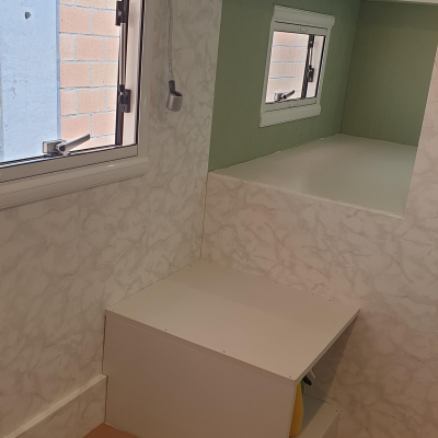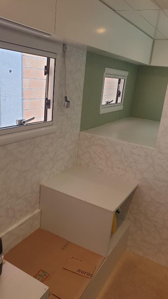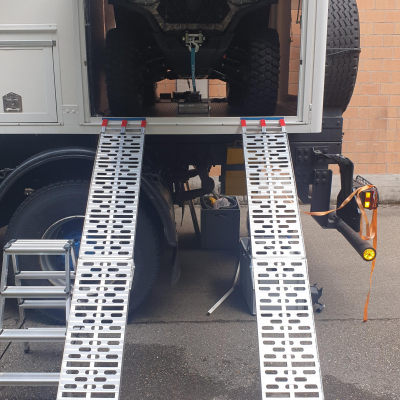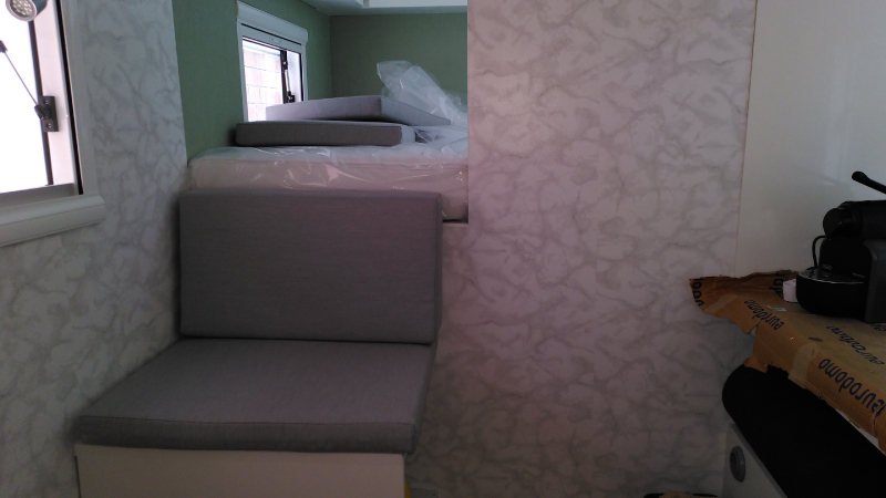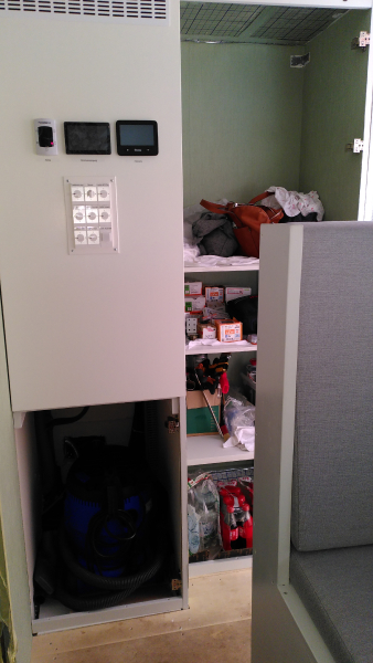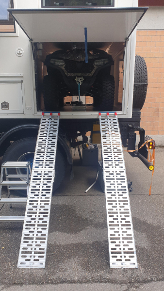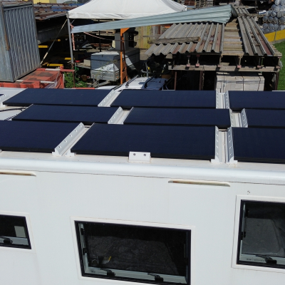 Clou: auf der Einstiegsseite ist eine ausfahrbare Terrasse geplant. Dazu werden 3 Holme aus der ganzen Wagenbreite ausgezogen und mit Gitterrosten (zum Transport an der äusseren Vorderseite der Wohnkabine in Schienen verstaut) 1,3 Kw Solarleistung mit flex-Modulen von Swaytronic, Kochen mittels 2-Platten Induktionsherd, 2 x KS nur elektrisch, Heizung Diesel + 12V + 230V Truma Combi D6 (ich möchte kein Gas im Fahrzeug). Tendenz zu 24V für Ausbau (kleinere Kabelquerschnitte, kleinere Ströme) Ist aber nicht möglich, daher 12V / 24V / 230V. Klimaanlage Dometic Freshwell 3000, Fluchttüre benötige ich nicht: keine Safaris geplant.  | |