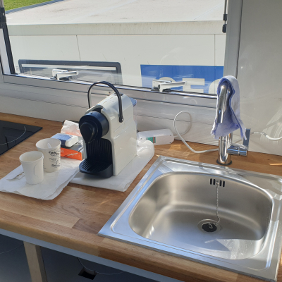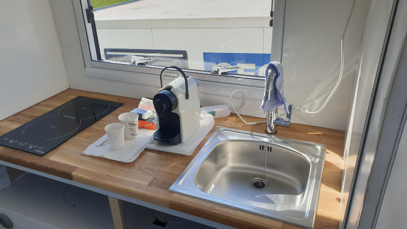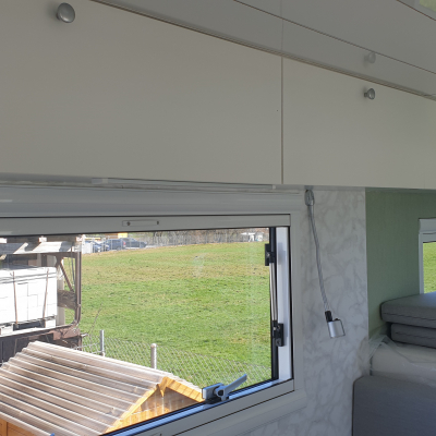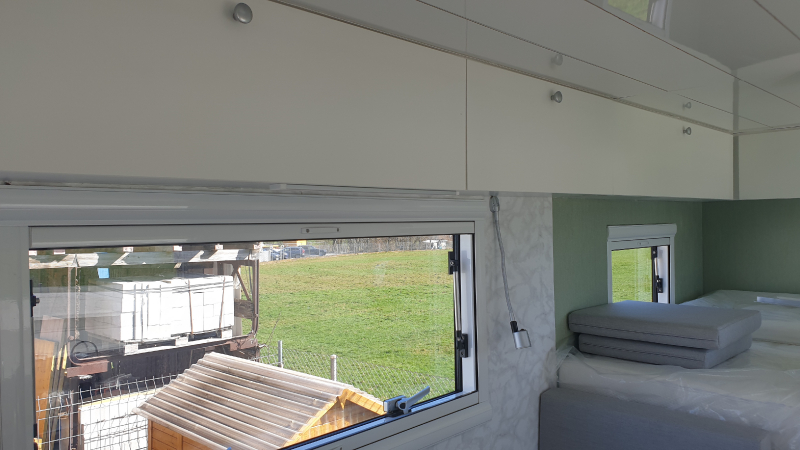 Clou: auf der Einstiegsseite ist eine ausfahrbare Terrasse geplant. Dazu werden 3 Holme aus der ganzen Wagenbreite ausgezogen und mit Gitterrosten (zum Transport an der äusseren Vorderseite der Wohnkabine in Schienen verstaut)