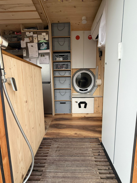 | Im Zwischenboden ist der Wassertank, Stauraum und unter der Garderobe/Toilette die komplette Technik sehr kompakt und mit möglichst kurzen Wegen verbaut. Alles ist ohne Werkzeug mit ein paar Handgriffen zu erreichen. | |