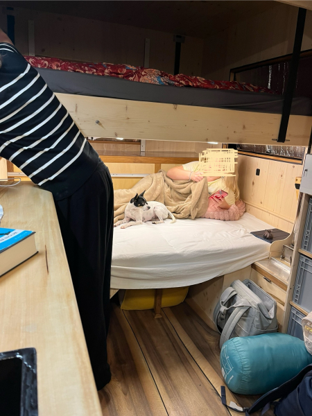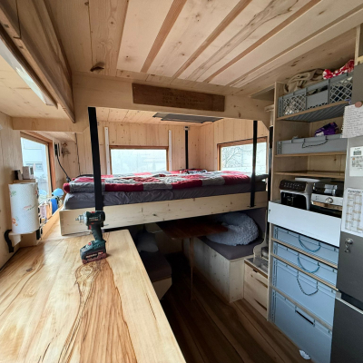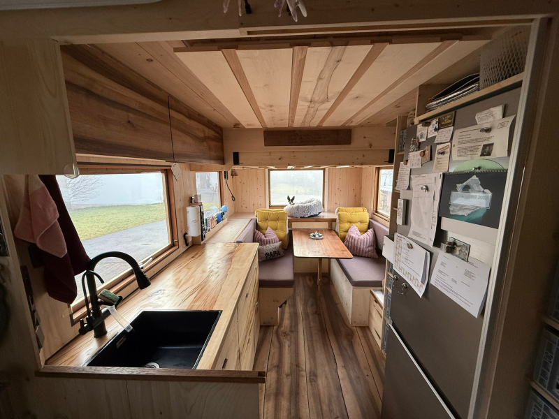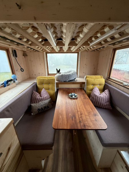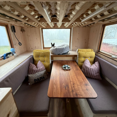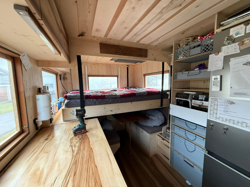 Den Grundriss haben wir so geplant dass möglichst viel Bewegungsraum bleibt. Hubbett im Heck, darunter die Sitzgelegenheit. Küche auf der rechten Seite, linke Seite Aufbewahrung, Holzofen ,Kühlgefrierkombi, WC,Waschmaschine,Garderobe. Vorne rechts befindet sich der Eingang mit Schmutzschläuse/Dusche Bad/Schuhschrank |