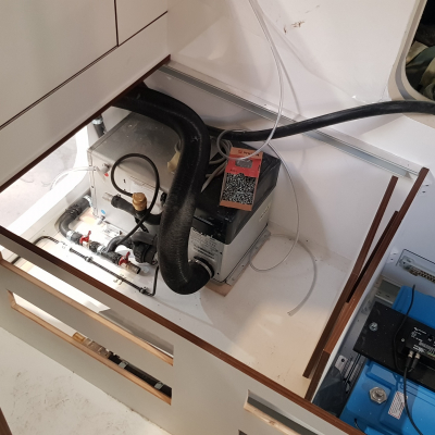 -Anschluss an Motorkühlwasserkreislauf-Heizen Wohnaufbau bei Fahrt - Vorheizen Motor -Temperatureinstellung -Heizkonvektoren + Wandheizkörper, unterheizter Funktionsboden -Heizregulierung (zusätzlicher Kreislauf mit Thermostat Regler) im Schlafzimmer | |