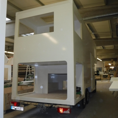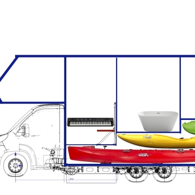 EBENE 3 Oberkante 130cm Wohnbereich Länge: 142 cm Breite: 214cm Höhe: 180cm Fahreseite: E-Piano, Fenster Seitz S4 1100mmx700mm Rückseite: Zugang zum Fenster Seitz S4 1450mm x 700mm Beifahrerseite: Sitzbank 140cm x 80cm, Fenster Seitz S4 1100mm x 700mm Dach: Ausguck Seitz HEKI 1 Dachfenster 960mm x 655mm Die Bodenfläche des Wohnbereiches kann als Bett genutzt werden. Aufnahmen für E-Piano und Sitzbank über Airline-Schiene und Querträger Boden 50mm: oben 9mm Multiplex, 39mm PU-Schaum, unten 2mm GfK Unter der Ebene 3 befindet sich die Heckgarage L:142 B:214cm H:125cm. [•Heckgarage Länge 142cm x Breite 214cm x Höhe 125cm] = [•Heckgarage-Volumen 3,7985 m3] Der Zugang erfolgt über eine Heckklappe B:184cm H:114cm und beidseitige Klappen B:114cm H:114m. Ebene 3 und Ebene 2 verbinden zwei Stufen Höhe 19,5cm -------------------------------------------------------------------------------- EBENE 2 Oberkante 91cm Küche/Bad Länge 177cm x Breite 214cm x Höhe 219cm Fahrerseite: (Bade-)Wanne L:120cm B:68cm H:60 Über der (Bade-)Wanne sind rechts und links jeweils zwei senkrechte Airlineschienen montiert. In die Airlineschienen lassen 120cm lange Querträger über der Badewanne einhängen. Auf den zwei Querträgern lassen sich Arbeitsplatten, z.B. 60cm x 60cm auflegen. Die Arbeitsplatten dienen als Küchenplatte, Esstisch, Schreibtisch, Arbeitsfläche, Werkbank, etc. In die zwei Querträger können alternativ Geschirrspülbehälter eingehängt werden. Bei der Benutzung mehrerer Querträger können mehrere übereinander liegende Ebenen geschaffen werden. Das ermöglich eine viele Kombinationen für übereinander liegende Arbeitsplatten, Geschirrspülbehältern und sonstige Behälter für viele unterschiedliche Funktionen. Die darunterliegende (Bade-)Wanne kann für alle Tätigkeiten mit Wasser genutzt werden: Kochvorbereitung wie Gemüse/Salat putzen, Abtropfen von nasser Bekleidung wie Skibekleidung oder Neoprenanzug, Wäsche waschen, Duschen und natürlich auch mal ein Vollbad nehmen. Unter der (Bade-)Wanne ist der Abstellplatz für eine 2-stufige Leiter und den Staubsauger. Rechts neben dem Bereich des Airline-Ablagesystemes schließ die Gaskocher/Grill Kombination an Breite 57cm x Tiefe 60cm Darunter befindet sich die Truma S3004 Gasheizung. Fenster über der (Bade-)Wanne und Gaskocher Seitz S4 1600mm x 600mm Über (Bade-)Wanne Gaskocher befinden sich 3 Oberschränke mit Auszügen und Klapptüren, Breite 177cm x Tiefe 50cm x Höhe 55cm Beifahrerseite: Dusche/Toilette/Waschbecken L:119cm B:87cm Unterschrank, Oberschrank, Fenster Seitz S4 900mm x 600mm Links daneben ist der Bereich Kühlschrank Oberschrank Breite 55cm x Tiefe 60cm x Höhe 30cm Kühlschrank Breite 55cm x Tiefe 65cm x Höhe 125cm Unterschrank Breite 55cm x Tiefe 60cm x Höhe 60cm Boden der 2ten Ebene 53mm: oben 12mm Multiplex, 39mm PU-Schaum, unten 2mm GfK Unter der Ebene 2 befindet sich die Mittelgarage L:180 B:214cm H:85cm In der Mittelgarage befindet sich rechts und links jeweils ein Radhaus [•Radhaus links Länge 177cm x Breite 41,9cm x Höhe 40cm] = [•Radhaus-Volumen 0,296652 m3] Radhaus rechts Länge 177cm x Breite 41,9cm x Höhe 40cm = [•Radhaus-Volumen 0,296652 m3] [•Summe Radhäuser-Volumen 0,593304m3] Der Zugang erfogt über die Heckgarage z.B. beim Einschieben von Booten. In der Mittelgarage befinden sich 2 Frischwassertanks und 2 Abwassertanks. Verfügbarer Platz in der Mittelgarage ist L:180cm x B:90cm x H:80cm] = 1,296 m3 [•Mittelgarage verfügbar Länge 180cm x Breite 90cm x Höhe 80cm] = [•Mittelgarage-Volumen 1,296 m3] Ebene 2 und Ebene 1 verbinden zwei Stufen Höhe 19,5cm -------------------------------------------------------------------------------- EBENE 1 Oberkante 52cm Eingang Länge 144,5cm x Breite 214cm x Höhe 258cm Beifahrerseite: Eingangstür Schnittmaß Breite 600mm x 2040mm ergibt lichtes Durchgangsmaß Breite 560mm x 2000mm Höhe Ebene 1 und den Einstieg durch die Eingangstür verbinden zwei Stufen 22,5cm Höhe Neben der Eingangstür ist eine Sitzbank B:75cm H:60cm, Seitz S4 Fenster 600mm x 600mm Über der Sitzbank in der Höhe von 160cm befindet sich ein Kleiderschrank mit Kleiderlift B:75cm. Unter der Sitzbank befindet sich der Gaskasten mit 2x11kg Gasflaschen Fahrerseite: Raum zur freien Verfügung Fenster Seitz S4 1000mm x 800mm Am Fenster wäre ein alternativer Platz für das E-Piano oder für eine Sitzbank. In der Höhe von 160cm über dem Raum zu freien Verfügung befindet sich ein Kleiderschrank mit Kleiderlift Breite 90cm. Rechts neben dem Kleiderschrank befindet sich ein vom Alkoven zugänglicher Wäscheschrank Breite 60cm x Tiefe 44,5cm x Höhe 100cm Im den Raum zur freien Verfügung können bei Bedarf zwei gegenüberliegende Sitzbänke mit Kulissenscharnieren eingesteckt werden. Sitzfläche Sitzbank vorne Länge 100cm x Breite 50cm Sitzfläche Sitzbank hinten Länge 100cm x Breite 50cm Die Sitzfläche der Sitzbänke kann hochgeklappt werden und gibt zum Stauraum Sitzbank Stauraum Sitzbank vorne Länge x 80cm x Breite 47cm x Höhe 37cm = 0,139 Kubikmeter Stauraum Sitzbank hinten Länge x 80cm x Breite 47cm x Höhe 37cm = 0,139 Kubikmeter Boden 16mm Pappelsperrholz Unter der Ebene 1 befindet sich die Frontgarage Länge 144,5cm x Breite 214cm x Höhe 50cm Der Zugang erfolgt über die Heckgarage z.B. beim Einschieben von Booten oder über eine Klappe auf der Fahrerseite Breite 100cm x Höhe 70cm oder über den Boden der Ebens 1welcher komplett geklappt oder entfernt werden kann. Zwischen der Ebene 1 und Ebene Alkoven ist 128cm Abstand. -------------------------------------------------------------------------------- EBENE Alkoven Oberkante 130cm Alkoven-Boden L:173cm B:214cm H:133cm Bett Länge 210cm x 140cm Breite Fahrerseite und Beifahrerseite Fenster Seitz S4 1100mm x700mm Zugang zum Wäscheschrank Fahrerseite Oberschränke vorne Dach Ausguck Seitz HEKI 1 Dachfenster -------------------------------------------------------------------------------- EBENE Fahrerhaus Zwisc