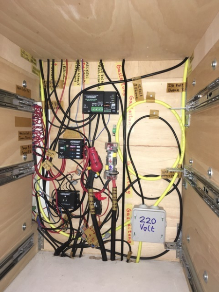 Die Stromverteilung befindet sich in Ebene 2 unterhalb des Kühlschranks, auf der Rückwand des darunter befindlichen Unterschrankes mit den drei Schubladenauszügen. Ursprünglich befand sich das Batterie/Lade/Wandler-Kombigerät direkt darunter im Boden der Ebene 2. Das Batterie/Lade/Wandler-Kombigerät wurde ersetzt durch: Batterieladegerät + 220 Volt Wandler befinden sich im Boden der Ebene 1. Die zwei Batterien befinden sich unterhalb des Beifahresitzes. [•RNK Unterschrank ] [•Unterschrank Länge 0,60m x Breite 0,50m] = [•Unterschrank-Boden-Fläche 0,3m2 Quadratmeter] [•Unterschrank-Boden-Fläche 0,3m2 Quadratmeter] x Höhe 0,67m = [•Unterschrank-Volumen 0,201 Kubikmeter] [•RNK Schubkasten-Auszug-Oben] [•Schubkasten-Auszug-Oben Länge 0,46m x Breite 0,465m] = [•Schubkasten-Auszug-Oben-Boden-Fläche 0,2139m2 Quadratmeter] [•Schubkasten-Auszug-Oben-Boden-Fläche 0,2139m2 Quadratmeter] x Höhe 0,145m = [•Schubkasten-Auszug-Oben-Volumen 0,0310 Kubikmeter] [•RNK Schubkasten-Auszug-Mitte] [•Schubkasten-Auszug-Mitte Länge 0,46m x Breite 0,465m] = [•Schubkasten-Auszug-Mitte-Boden-Fläche 0,2139m2 Quadratmeter] [•Schubkasten-Auszug-Mitte-Boden-Fläche 0,2139m2 Quadratmeter] x Höhe 0,17m = [•Schubkasten-Auszug-Mitte-Volumen 0,0363 Kubikmeter] [•RNK Schubkasten-Auszug-Unten] [•Schubkasten-Auszug-Unten Länge 0,46m x Breite 0,465m] = [•Schubkasten-Auszug-Unten-Boden-Fläche 0,2139m2 Quadratmeter] [•Schubkasten-Auszug-Unten-Boden-Fläche 0,2139m2 Quadratmeter] x Höhe 0,215m = [•Schubkasten-Auszug-Unten-Volumen 0,04598 Kubikmeter] [•RNK Stromverteilung] [•Stromverteilung Tiefe 0,08m x Breite 0,50m] = [•Stromverteilung-Boden-Fläche 0,04m2 Quadratmeter] [•Stromverteilung-Boden-Fläche 0,04m2 Quadratmeter] x Höhe 0,67m = [•Stromverteilung-Volumen 0,0268 Kubikmeter] [•Unterschrank-Volumen 0,201 Kubikmeter] Davon sind [•Stromverteilung-Volumen 0,0268 Kubikmeter] [•Schubkasten-Auszug-Oben-Volumen 0,0310 Kubikmeter] [•Schubkasten-Auszug-Mitte-Volumen 0,0363 Kubikmeter] [•Schubkasten-Auszug-Unten-Volumen 0,04598 Kubikmeter] [•Unterschrank-Volumen 0,201 Kubikmeter] [•Unterschrank-Volumen NUTZUNG 0,14008 Kubikmeter] [•Unterschrank-Volumen AUSZUG-GEHÄUSE-LUFT 0,06092 Kubikmeter] Von Außen ist nichts zu sehen. Durch öffnen der Schubladen hat man Sicht auf die Stromverteilung, z.B. auf die Kontrollleuchten des Solarreglers. Die Stromverteilung ist bei Bedarf durch Herausnahme der Schubladen direkt zugänglich. Die Kabel nach oben gehen: -direkt zum darüber stehen Kühlschrank; -zu den Solarpanelen; -zwei 220 Volt Kabel in den Alkoven und in Ebene 3; -zwei 12 Volt Kabel in den Alkoven und in Ebene 3; Die Kabel nach unten gehen: -zur 220 Volt Landstrom-Einspeisung; -zum 220 Volt Wechselrichter, -zur 12 Volt-Einspeisung; -zu den elektrischen Geräten im Keller; Beleuchtung ohne Kabelverlegung BOSCH LED Akku-Lampe Professional GLI 12Volt mit 2 Ampere Li-Ion Akku 4 Stück TYP 300 300 Lux 16 Stück TYP 330 350 Lux 20x 2 Ampere = 40 Ampere zusätzliche Batteriekapazität Die Lampen können an jeder Position im Fahrzeug angebracht werden. ? Länge ?cm x Breite ?cm = [• ?-Fläche ?m2 Quadratmeter] [• ?-Fläche ?m2 Quadratmeter] x Höhe ?cm = [•?-Volumen ?m3 Kubikmeter] | |
