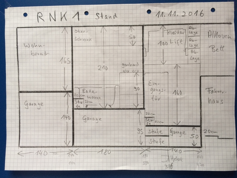Die planerischen Möglichkeiten innerhalb eines Wohnmobiles sind durch das Volumen des Aufbaues (Grundfläche x Höhe) begrenzt. Bei der Planung wird versucht, das zur Verfügung stehende Volumen nach den eigenen Bedürfnissen sinnvoll und bestmöglich zu nutzen. Wie gut das Volumen genutzt ist oder wie das Volumen hätte genutzt werden können, erahnt man beim Vergleich mit anderen Wohnmobilen, z.B. hier in der Fahrzeuggalerie oder im Buch Wohnmobile selbst ausbauen. Nach 17 Jahren und 390000 km im ersten Wohnmobil wird aus technischen Gründen ein Nachfolger geplant. Bei der Planung des neuen Wohnmobils sollen der Aufbau verbessert, die Technik vereinfacht und bei gleicher Parkfläche die Nutzungsmöglichkeiten vergrößert werden. Bei dem Projekt [•RNK001] wird versucht herausfinden, welche Raumnutzung bei einer gegebenen Parkfläche, hier Länge 7,20m x 2,25m Breite, maximal möglich ist. Da wurde auch der Platz für eine Badewanne gefunden. Der Prozess der persönlichen Optimierung der Raumnutzung ist Teil jeder Planung eines Wohnmobiles. Das Ergebnis der Planung ist für viele Projekte dokumentiert. Die Raumnutzungskennzahl [•RNK] soll die Nutzungsmöglichkeiten in dem zur Verfügung stehenden Volumen des Wohnmobiles durch konkrete Berechnungen nachvollziehbar und vergleichbar in Zahlen abbilden. [•Raum zum machen] [•Raum zum ruhen] [•Raum zum bewegen] [•Raum zum lagern] [•Raum zum gehen] [•Raum zum schließen] [•Raum zum fühlen] [•Raum zum sehen]