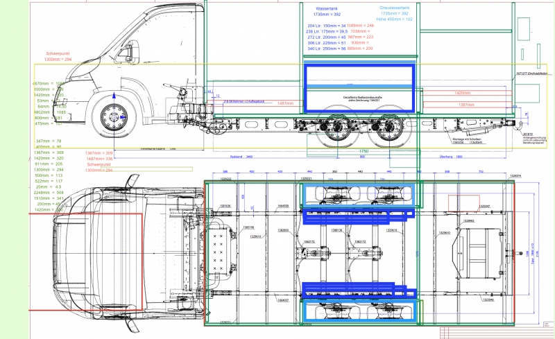 VB Airsuspension Voll-Luftfederung 4C, Lieferung und Montage durch Carsten Stäbler Kirrlach ========================================= Berechnung [•RNK Fahrzeug] [•Fahrzeug Länge 710cm x Breite 225cm] = [•Park-Fläche 15,975 m2 Quadratmeter] [•Park-Fläche 15,975 m2 Quadratmeter] x Höhe 350cm = [•Park-Volumen 55,8125m3 Kubikmeter] ====================================== [•Aussparung Radkasten] Der Minimum-Abstand Reifen bis Höhe 380mm zum Radkasten ist 30mm. Zusätzlich soll bis zur Höhe 130mm ein Aussparung bis zur Rahmenspur Y sein. Da der Aufbau in GfK Platten aber nur senkrecht bis 380mm geht, ist der Abstand des gesamten Radkasten bis zum Reifen [•Aussparung Breite = Abstand Reifen bis Rahmenspur Y] [•Aussparung Breite = Abstand Reifen bis Rahmenspur Y] [•Aussparung Höhe 130mm] [•Aussparung Länge 1700mm] [•Aussparung Volumen m3] Die [•Aussparung Breite = Abstand Reifen bis Rahmenspur Y] wird nur beim Einbau der ALKO Luftfederung benötig. Wird die ALKO Luftfederung nicht verbaut kann [•Aussparung Breite = Abstand Reifen 60mm] sein Die Vergrößerung der Breite kann bei den Wassertanks dann bis zur Höhe 85cm der Garage 2 genutzt werden. Die ergibt auf beiden Seiten ein größeres Volumen der Wassertanks von links und rechts jeweils circa 300 Liter. | |