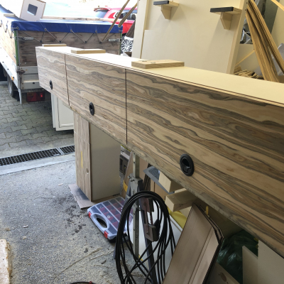 | Pappel Sperrholz mit SaRaiFo Apfelbaum furniert und matt lackiert, Waschbecken Mineralwerkstoff | |