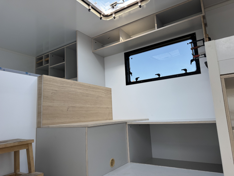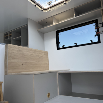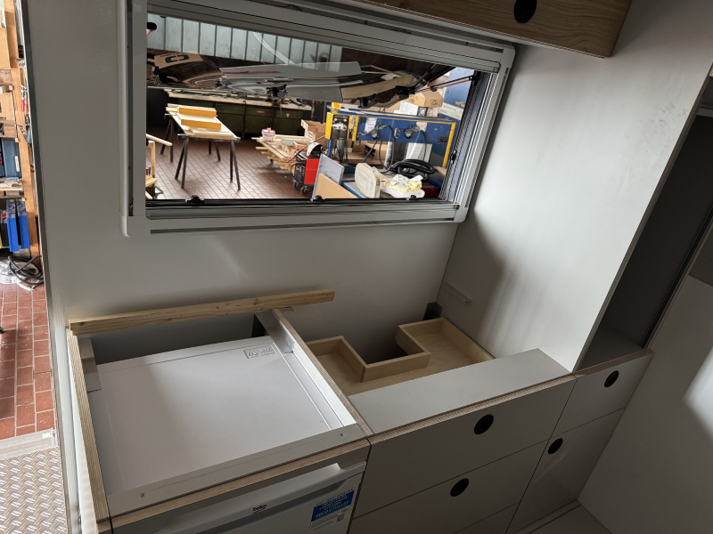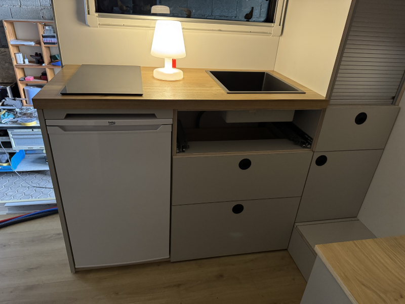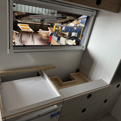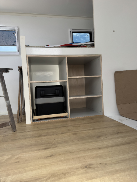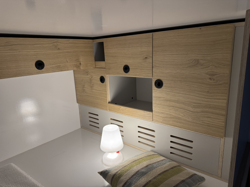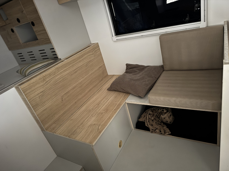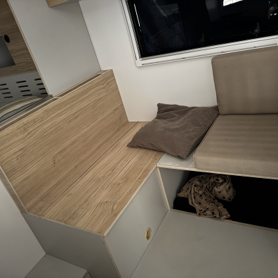 Hinten großes Heckbett, daneben Schränke, Die Küche mit Kühlschrank auf der rechten Seite. Dann der Eingang mit Garderobe. Dahinter das WC mit kleinem Waschbecken. Die Dusche im Durchgang, dann das Schnarcherbett :-) darunter finden die Hunde ihren Platz, eine kuschelige Eckbank mit Tisch, so der Plan. |