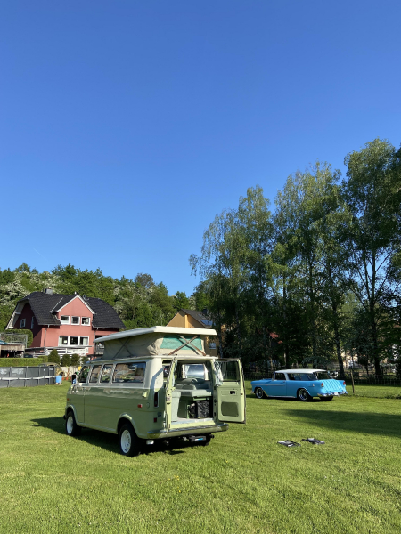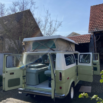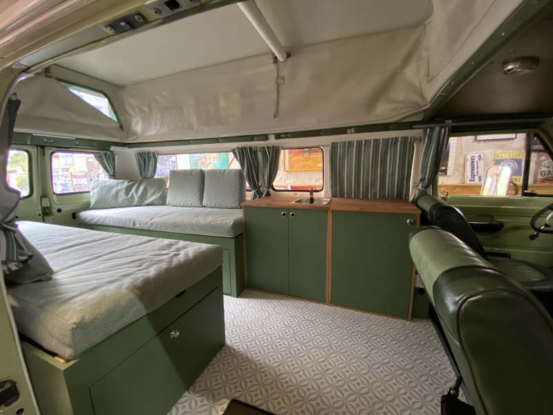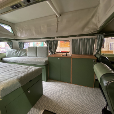 2 Betten (175/195cm), die verbunden werden können zu einer 170cm breiten Liegefläche; Küchenschrank und Toilettenschrank auf der Fahrerseite |