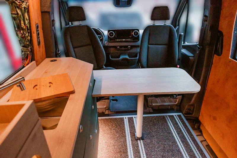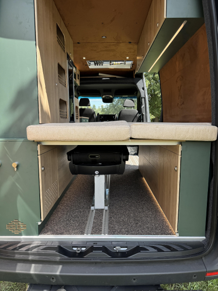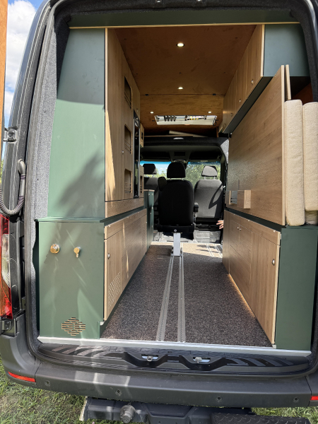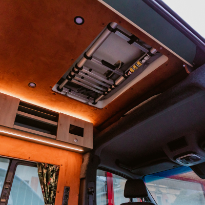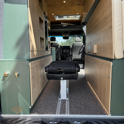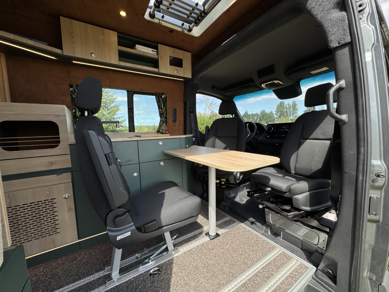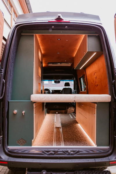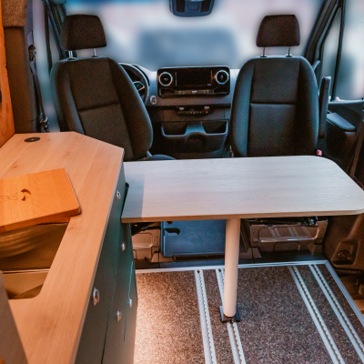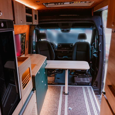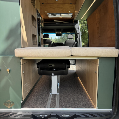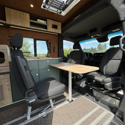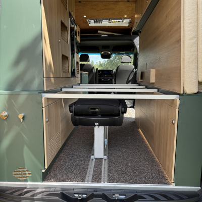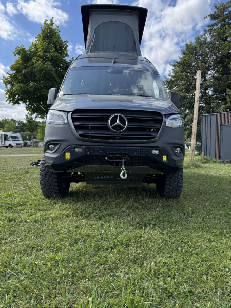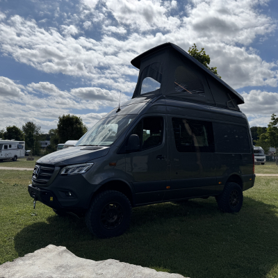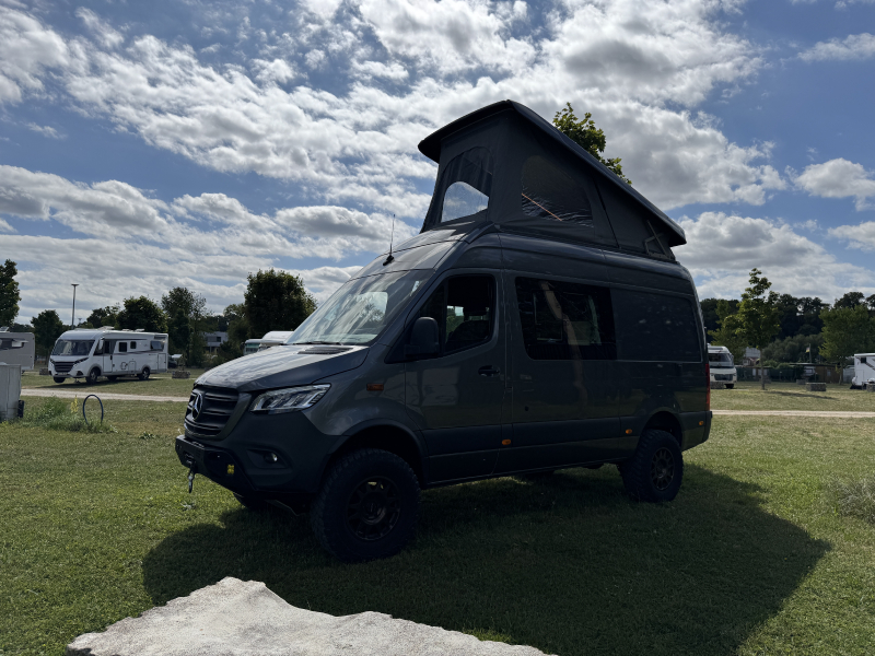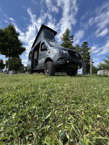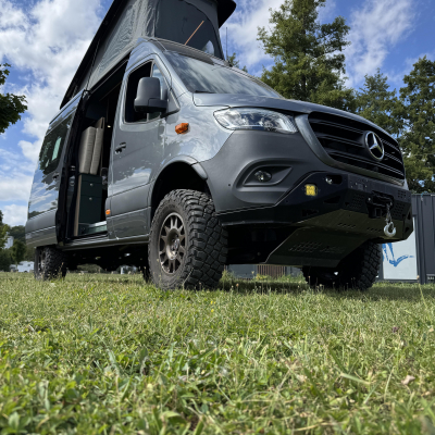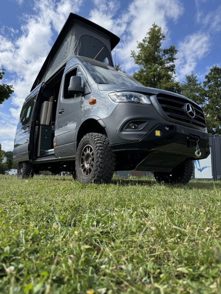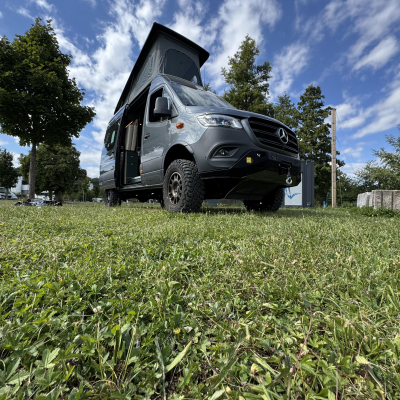 Vorführfahrzeug. Idee: Flexibler Innenausbau mit bis zu 5 zugelassenen Sitzplätzen. Großes Bett im Aufstelldach (135x2100) Zweites Bett im Fahrzeug. Bad: Nasszelle zum Einhängen mit Warmwasser. Küche: Kochfeld herausnehmbar, Dometic Kühlschrank, Spüle Elektrik und Wasser: Basisfahrzeug: Sprinter 419 CDI 4matic AUsstattung: Fahrzeugumbauten: Aufstelldach Unterfahrschutz Fahrwerk Rad/reifen Windenstoßstange mit Warn Evo