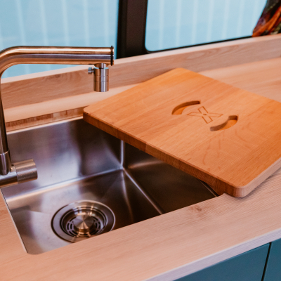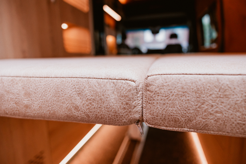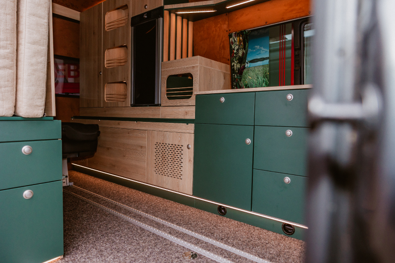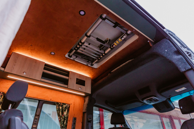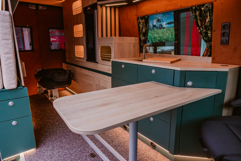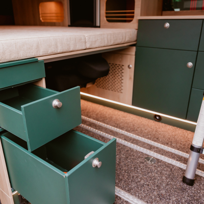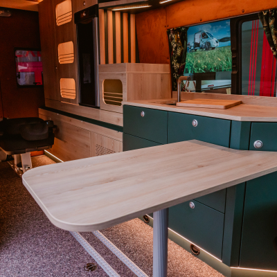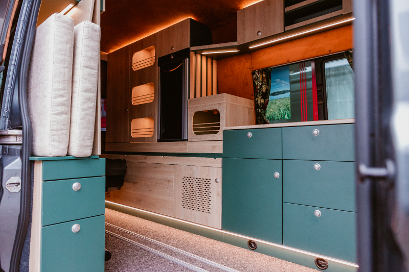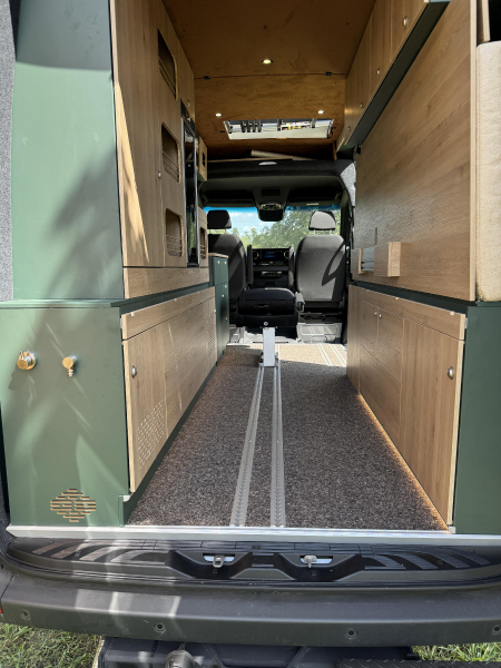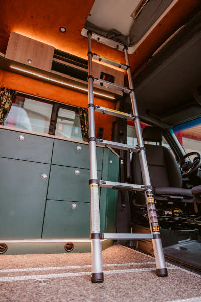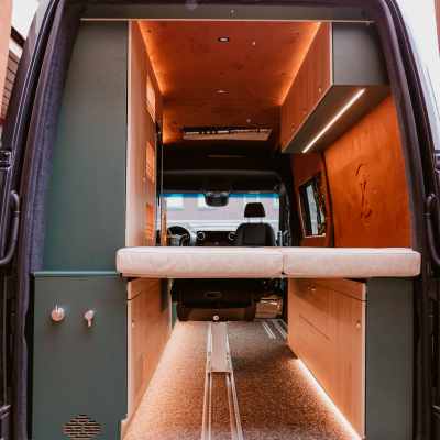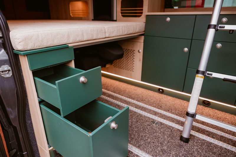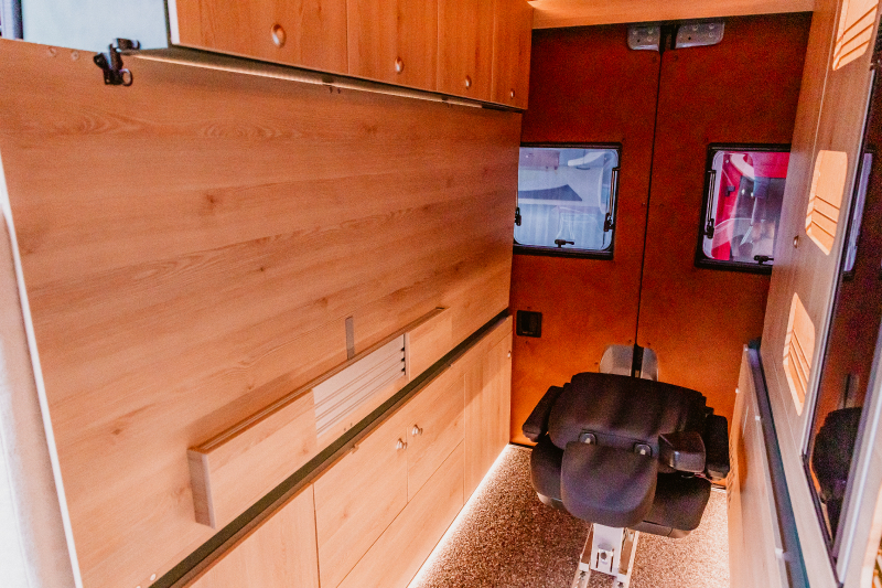 Flexibler Innenausbau mit seitlich wegklappbarem Bett zum Transport von z.B. Motorrad oder Fahrrädern.