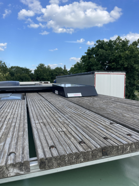 | Der Koffer wurde aufwendig um 16cm erhöht und restauriert. Dabei wurden alle Außenbleche unter den Fenstern erneuert. Er hat eine neue Stehhöhe mit Dämmung und Innenausbau von knapp 190cm. | |