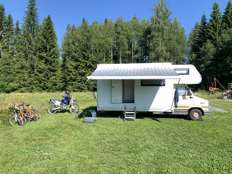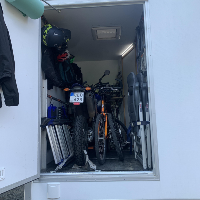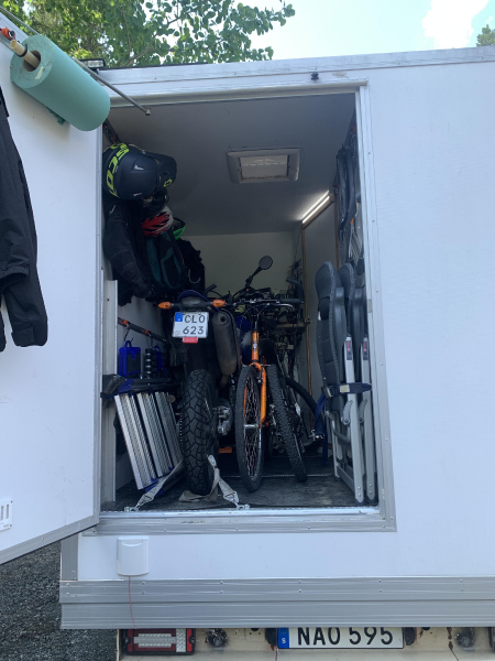 Sandwich panels manufactured, cut to shape and delivered to door by company www.dalalaminat.se Double floor: Inner floor 25 mm thick (2x 1,8 mm GRP skin, distance material: 21,4 mm XPS). Garage for two dirt bikes. |