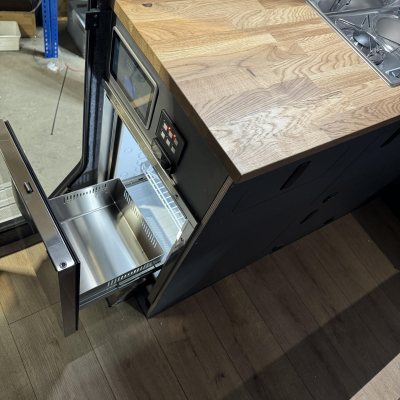 | Ein Auszugmodell, das in den Eingangsbereich ragt, somit kann man bei offenem Kühlschrank zwar nicht rein und raus, aber dafür von beiden Seiten Dinge entnehmen | |