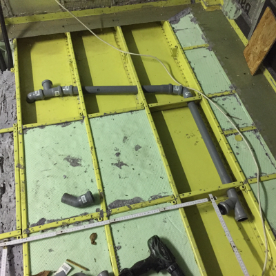 Der Shelter wurde komplett entkernt: Innenbleche an Wänden, Decke und Boden wurden rausgenommen (ca. 3000 Nieten abgeschliffen), die Schaumstoff-"Isolierung" durch 6cm PIR/PU ersetzt. Leerrohre für Strom und die Abwasserleitungen konnten somit "unter Putz" gelegt werden. Die Kabine wird "rückwärts" fahren, die orig. Tür wird ausgebaut und mit Alublech verschlossen. Sie bekommt eine neue Tür, Belluna-Fenster sowie eine Dachluke. | |