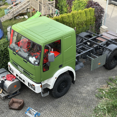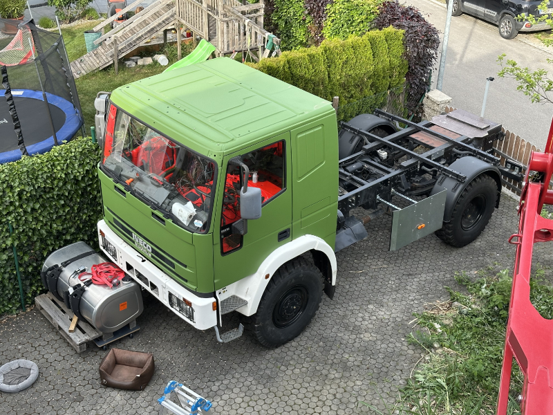 Seit über zehn Jahren träume ich vom eigenen Allrad-Camper (eigentlich schon viel länger). Nach Unimog und MAN hatte ich 2020 den Renault M180 im Visier. Dieser war allerdings zu kurz und zu schwer und auch zu teuer. Also wurde es eine Iveco Allrad Feuerwehr. Mit nur 20.000km ohne Rost und, typisch Berufsfeuerwehr topp gewartet. Im ersten Schritt haben wir alles abgebaut, gereinigt und das Fahrzeug umbereift. Dann hab ich es als Fahrgestell zugelassen, die Einspritzung überholen und ein Tuning machen lassen und war 2023 auf der Abenteuer&Allrad damit. Jetzt sind wir seit ein paar Wochen am Kürzen des Fahrerhauses. Wir tauschen dazu die Seitenwände gegen neue des Iveco Fernfahrerhauses und setzen die Rückwand entsprechend nach vorne. (Siehe Fotos)