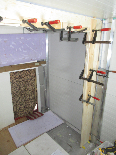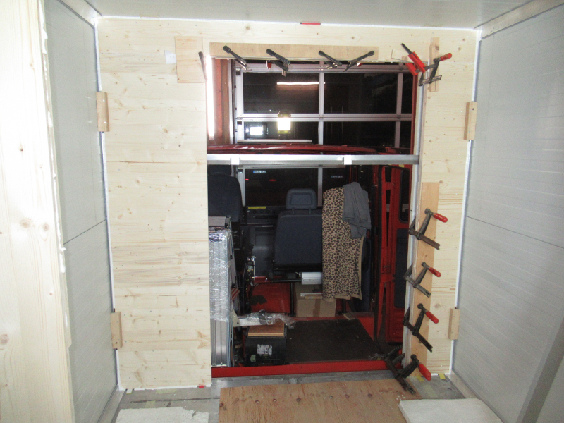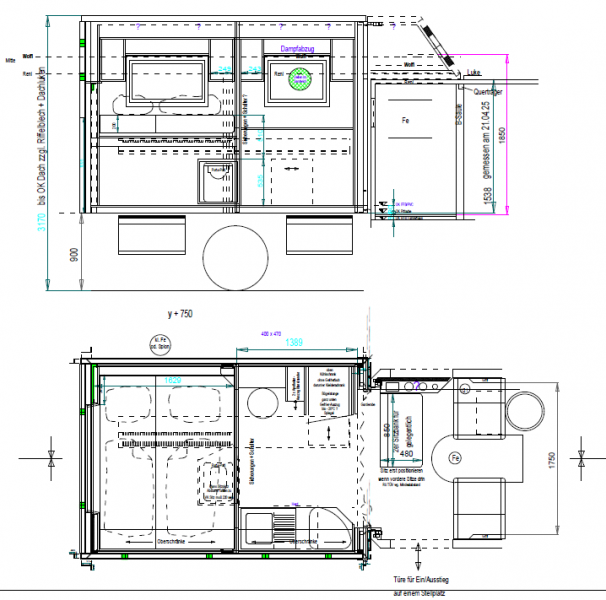 | Doka wird in Verbindung mit Kabine durchgängig bewohnt. Die Sitze sollen als Drehsitze umgerüstet werden. Der Tisch soll bewusst vom Armaturenbrett nach hinten laufen, damit wenn wir an einem schönen Platz stehen, beide den Blick durch die große Frontscheibe haben. Hinten sind noch 2 weitere Sitzplätze durch eine VSR-Sitzkonsole geplant, damit wir unsere beiden Enkel od. event. einen Fahrgast mitnehmen können. Der Zugang von außen ist die hintere Türe auf der Beifahrerseite, also kein weiterer Zugang in die Kabine oder Treppe erforderlich. Hinten im Kabinenaufbau ist in Fahrtrichtung links ein Kleiderschrank, der Kühlschrank und übereinander angeordnet noch Apothekerschränke geplant. Dahinter ein Bad-Waschbecken. D.h. wenn jemand das Bad/WC benutzt wird der Vorhang zwischen Kabine und Fahrerhaus geschlossen und dort hinten bleibt dann viel Platz. Auf der rechten Seite kommt die Küche, ganz hinten das Bett. Unterm Bett wird das WC ausgezogen, welches einen Trittfesten Deckel bekommt. Die Höhe ist genau die halbe Höhe zum Bett. Unter dem Bett ist auch mein Elektro-Klavier welches ich nach vorne zum spielen ausziehen kann. Ja und unterm Bett sind Stauraum und Platz für die Stromtechnik. |
