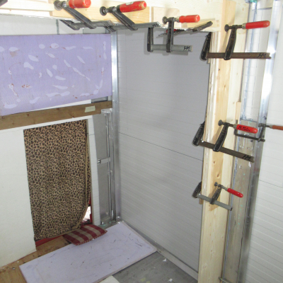 | Wir bauen die Kabine fest auf die Pritsche, unser Karrosseriebauer hat das Fahrerhaus ab der B-Säule im Dach- und Rückwanbereich ausgeschnitten. Am Übergang haben wir für eine "leichte" Verschränkung (auf jede Seite 100 mm) eine Sonderlösung aus Alukantteilen und einer Balgdichtung von Accordeonseal vorgesehen. Über dem Kabinendach wird ein Aludeckel aus Riffelblech den Aufbau ab der B-Säule überdecken. Der Deckel hat ein wenig Abstand, so daß die Verschränkung möglich ist. Wir gehen nicht ins grobe Gelände und sind nach einigen Test- und Meßfahrten der Meinung, daß das funktioniert. | |