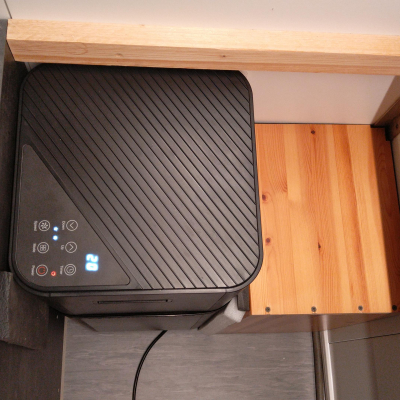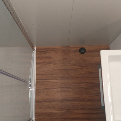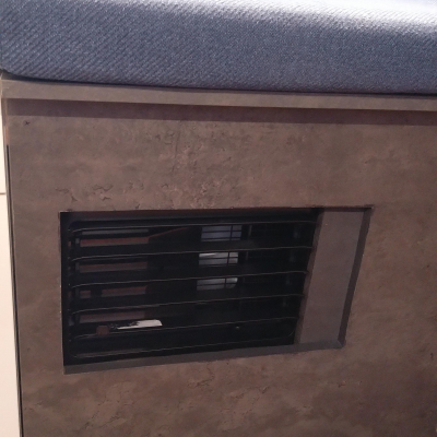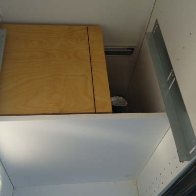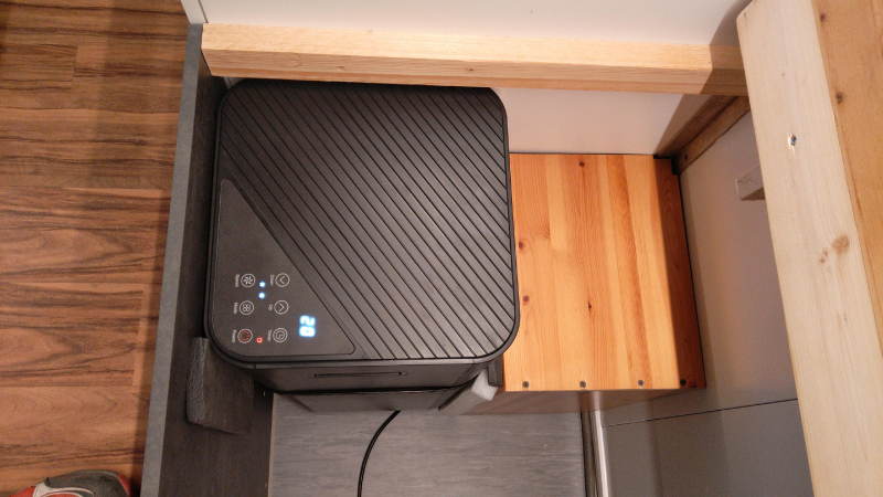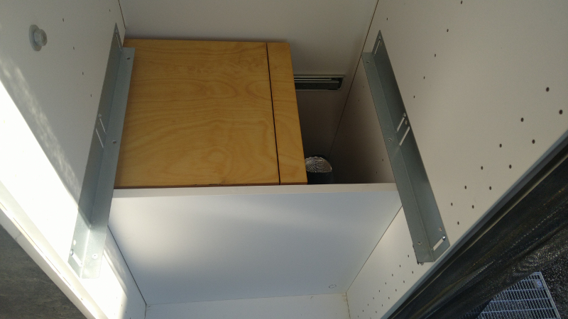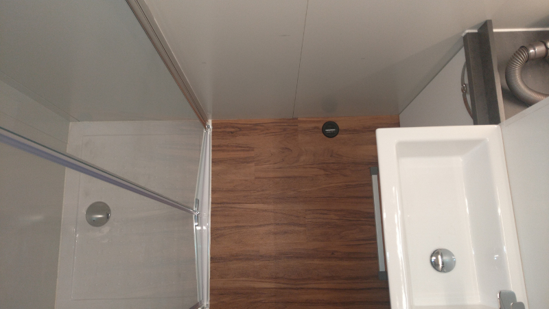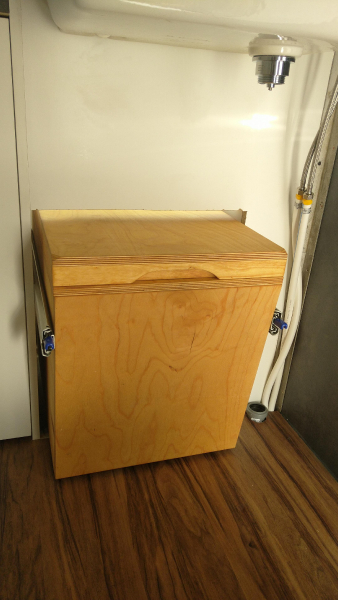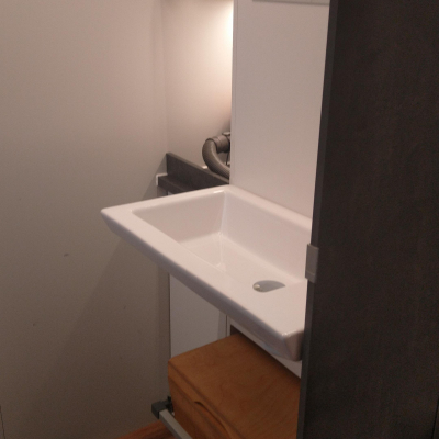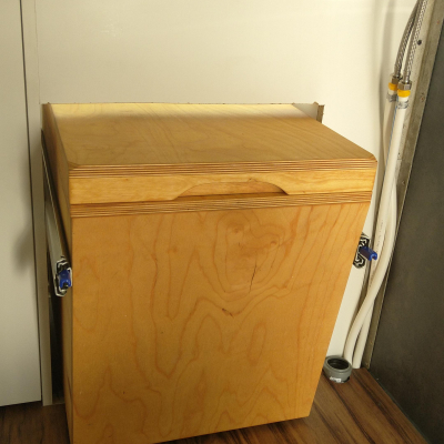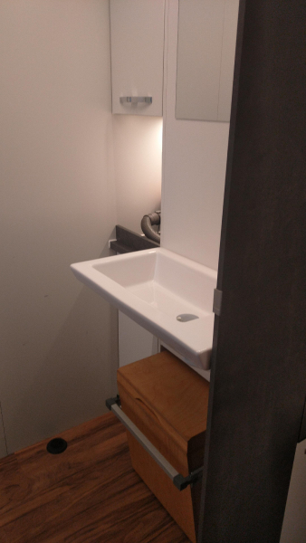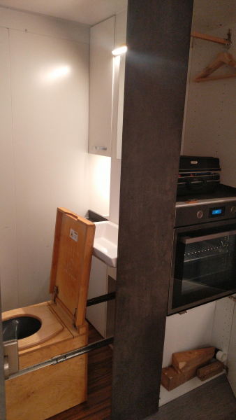Toilette wird über zwei rastbare Schwerlastauszüge in den Raum gezogen, und zwar mit einem leichten Gefälle in den Schienen, damit das Gehäuse ganz ausgefahren auf dem Boden steht und eingefahren ca. 1cm über dem Boden "schwebt". Vermeidet Schleifspuren auf dem Boden. 2 Zusatz-Urinkanister für längere Standzeiten ohne Entleerungsmöglichkeiten | |