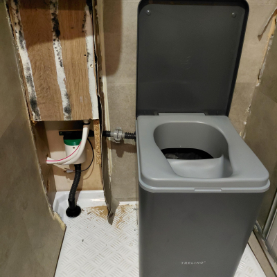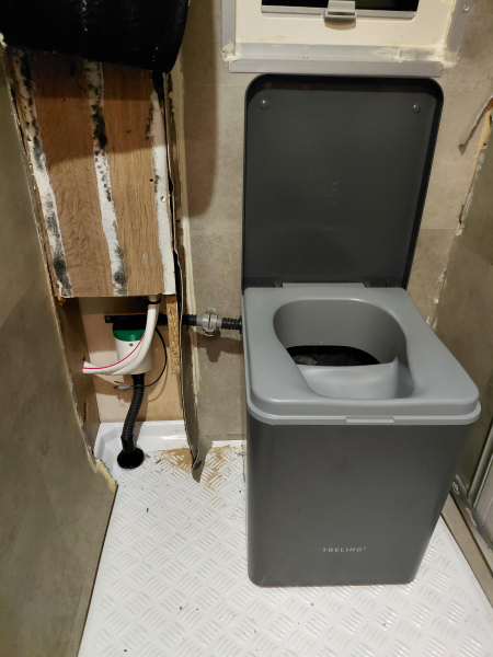 Man kann die Toilette herausnehmen wenn man duschen will .. mit einem Bajonettverschluss kann man die Abluftleitung trennen ..