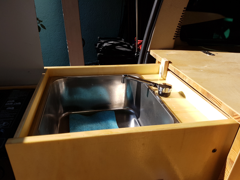 Wasserpumpe im Frischwassertank, Spüle, Abwassertank herausnehmbar, alles im Küchenblock