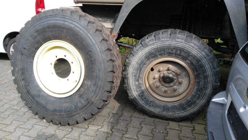 | Da ich überwiegend in Europa auf der Straße fahren werde, werde ich auf die einteilie Stahlfelge zurückgreifen. Mit 445/75 R22,5 mit Goodyear Baustelle. (Der hat den gleichen Abrollumfang wie der 14,00 R20) Dieser ist in Europa gut zu beschaffen. Kann auch mit speziellen Montierhebeln selber vor Ort gewechselt werden. Es wird mit einem Luftdruck-Kontrollsystem von CONTI Pressure Check ausgesteattet. Damit wird das andauernde "haste noch Luft auf`n Schluffen" automatisiert ! Ca. 600 € sind gut angelegt | |