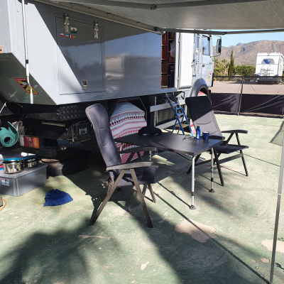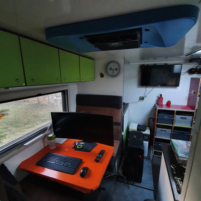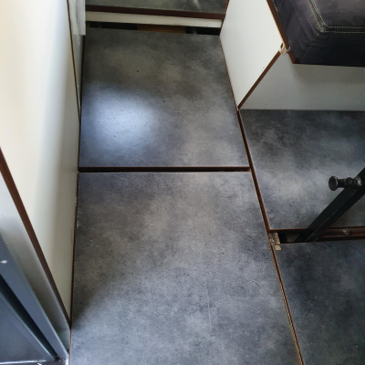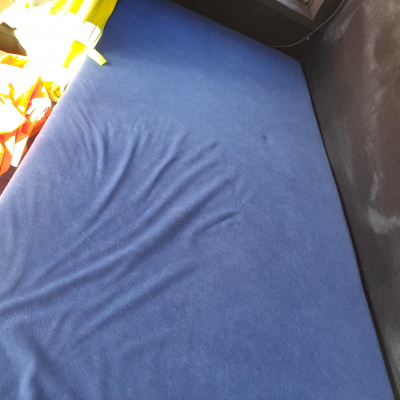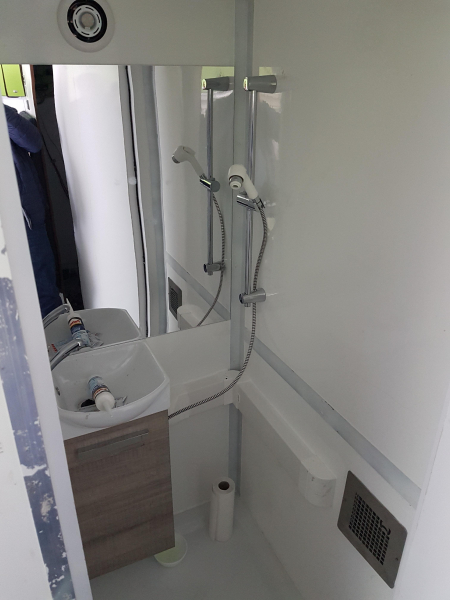 In der Duschzelle (920 x 910 mm) d Wärmetauscher vom Warmwasser des Boiler. Führerhaus durch Alubutyl Schallgedäpft plus Schallisomatten bis 80 mm. Super Ergebnis, jetzt kann man sich in normaler Lautstärke unterhalten und Radio hören. Da merkt man nicht mehr, dass es ein luftgekühlter Dieselmotor ist, der mal ganz schön gebrummt hat. Weiterhin 200 x 80 cm Liege hinter den Sitzen. | |