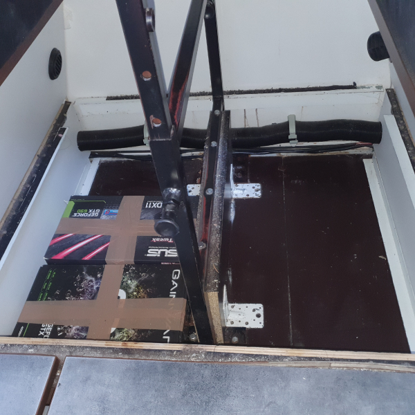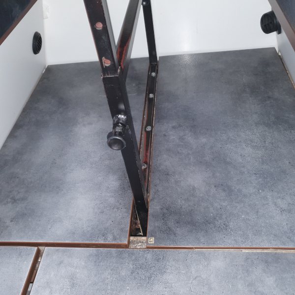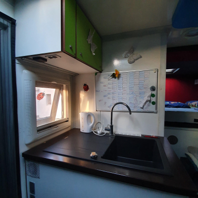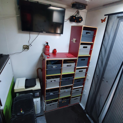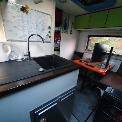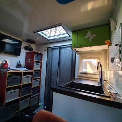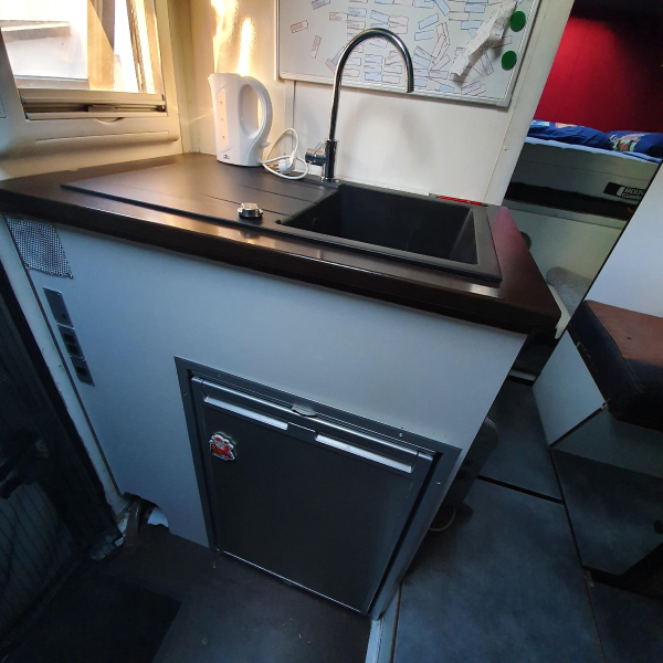 | Arbeitsplatte, Spüle, Tischplatte 30 mm, Tisch höhenverstellbar, Eigenbau; Küchenarbeitsplatte. Es ist ein Doppelboden, wobei unter den Abdeckplatten noch viel Stauraum ist und ein wärmerer Fußboden erreicht wird. 14 große Fächer mit Staukästen. | |