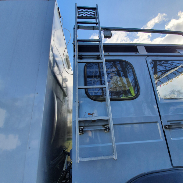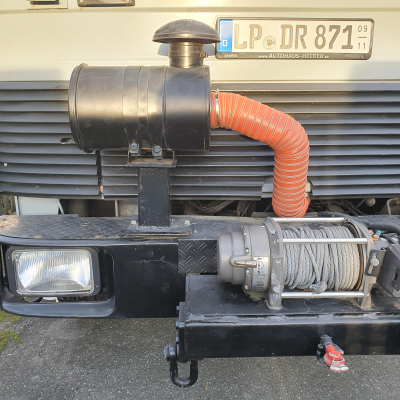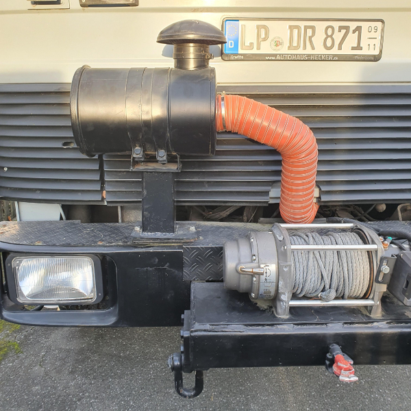 | manuelle Seilwinde hinten, WARN Seilwinde vorn, gekürztes Führerhaus, neue Alu-Schutzbleche, Farbe Aufbau silbergrau, Führerhaus fehgrau, Luftfilter höher gelegt, Leiter seitlich angebaut, 2 x HELLA Fernlichtleisten 430 mm, seitlich r/l je 1 LED-Arbeitsleuchte; 4 Reservekanisterhalter a 20 l, 1 a 10 l abschließbar mit Schloß, mit Alutür abgedeckt. | |
