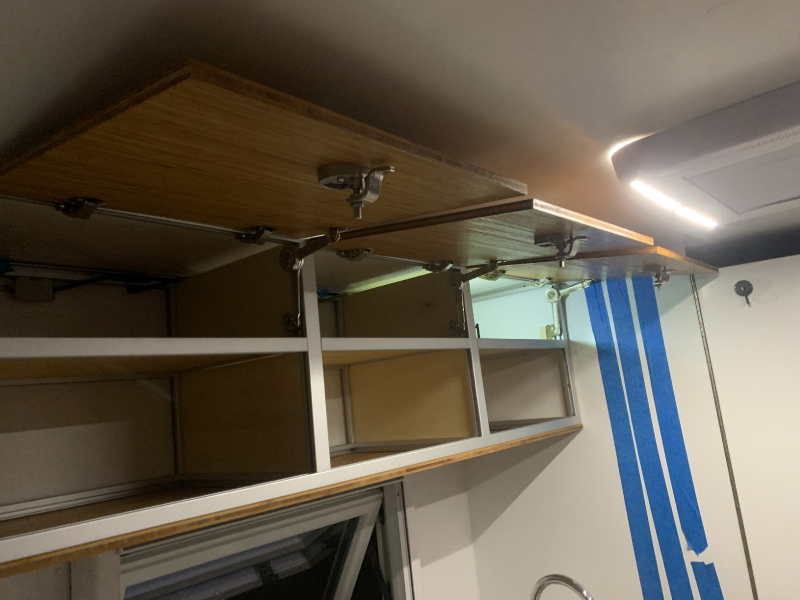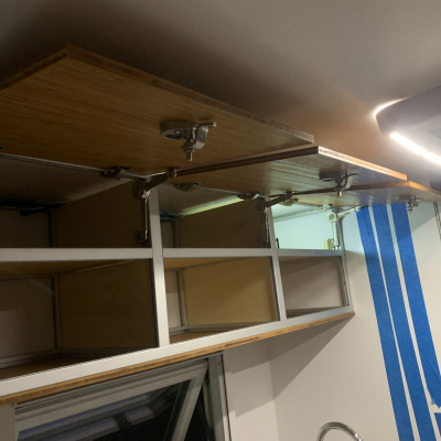Ausziehbett über die erhöhte Sitzgruppe Küche mit portablem Induktionskochfeld Durchgang über der Dusche Stauraum klappbare Pedelec-FatBikes |