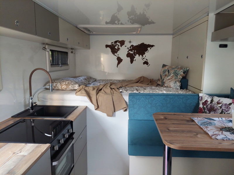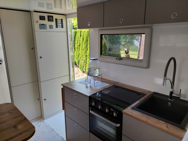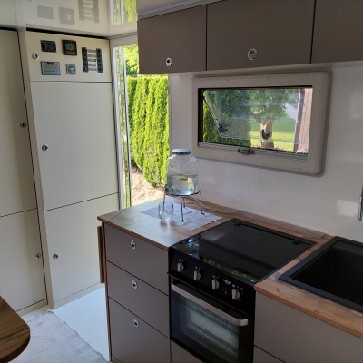– von außen zugängliche 2 Stauraumklappe Kofferraum Größe L/B/H 2,4m/1,5/1m– Küchenzeile mit Spühlbecken und Gas Backofen.