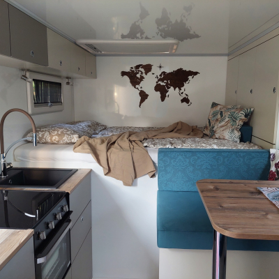 Die durchdacht ausgebaute Wohnkabine bietet alles, was man für langes, autarkes Reisen braucht: