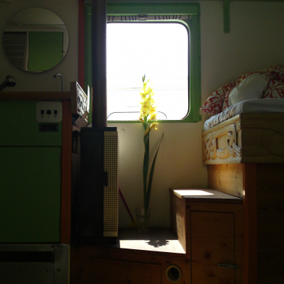 | Bett vorne links, Tisch vr, Abwaschbecken ml, Eingang mr, Küche mr, Kästen hl, Sitzbadewanne hl, Kühlschrank hr, Trenntoilette hr |