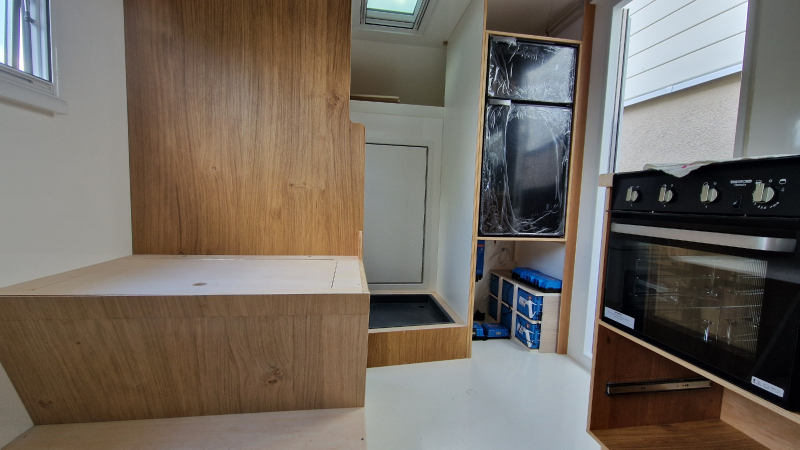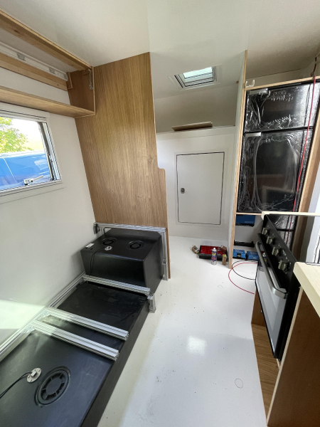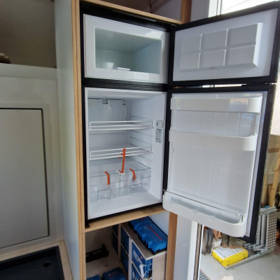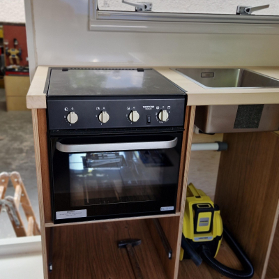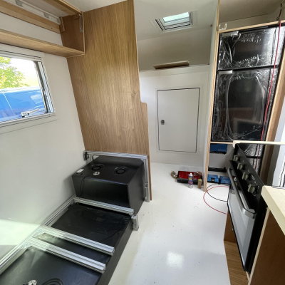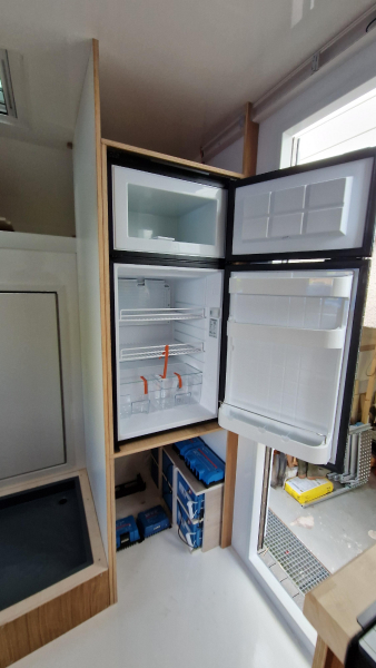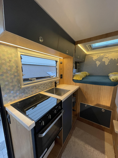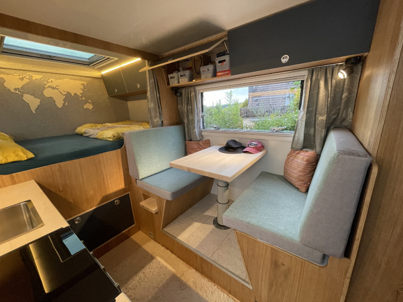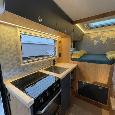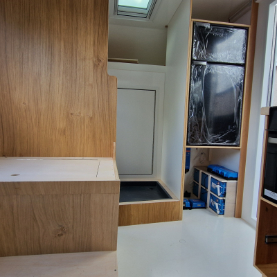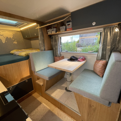Wir haben einen kleinen Stauraumalkoven über dem Fahrerhaus. Anschließend gibt es eine Nasszelle mit Dusche und Trockentrenntoilette. Daneben ist der Kühlschrank/ Eisschrank untergebracht. Im Mittelteil ist die Küchenzeile und die Dinette. Unter der Dinette sind die Frisch- und Grau- Wassertanks platziert. Hinten ist der Schlafraum mit einer 2,0m x 1,4m Matratze. Darunter befindet sich der "Keller". |