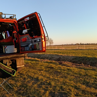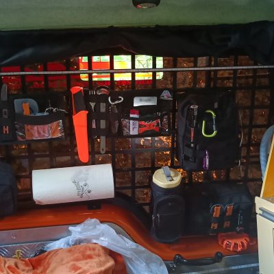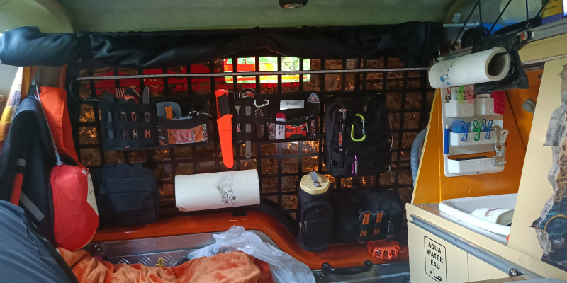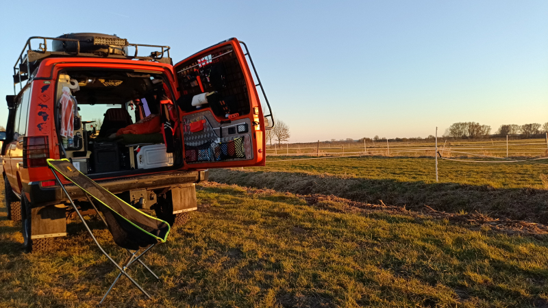 Einfacher Selbstausbau mit Schlafplatz für 1 Person (Beifahrerseite), Stauraum unter der Schlaffläche für Werkzeug/Ersatzteile/Isomatten/Bekleidung, Hochschrank (Fahrerseite) mit Waschmöglichkeit, Stauraum für 20l Wassertank, Geschirr, Gaskocher (Koffer), Waschutensilien, Heckklappentisch aus Alu.