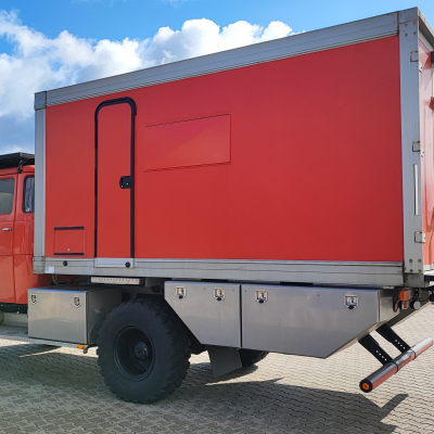 Tausch Wohnkoffer. Alter Koffer runter. Neuen Kühlkoffer auf Kipper-Ladefläche ausbauen und auf neuem Zwischen rahmen aufsetzen. Dämmung und Ausbau der DoKa und so weiter...