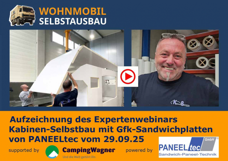 Wer schon immer wissen wollte, wie Gfk-Sandwichplatten für den Wohnkabinenbau produziert werden, der kann sich mein Interview mit PANEELtec-Geschäftsführer Jürgen Schmidt anschauen. Dort gibt es spannende Infos zum Thema - und wer will, bekommt dort einen kompletten Bausatz für den Selbstbau seiner Kabine.